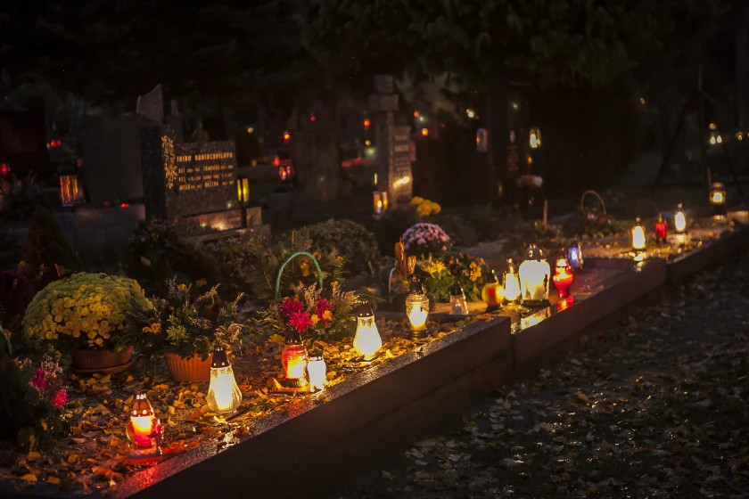 - Zdobení hrobů a zapalování svíček: Zdobení hrobů květinami, věnci a svíčkami je tradičním způsobem, jak lidé projevují svou lásku a péči o zesnulé. Květiny symbolizují krásu a nesmrtelnost duší, zatímco svíčky představují světlo, které osvětluje cestu zemřelým do věčnosti. Tato výzdoba hrobů vytváří na hřbitovech dojem barevné a světelné oázy, která odráží důležitost památky zesnulých.